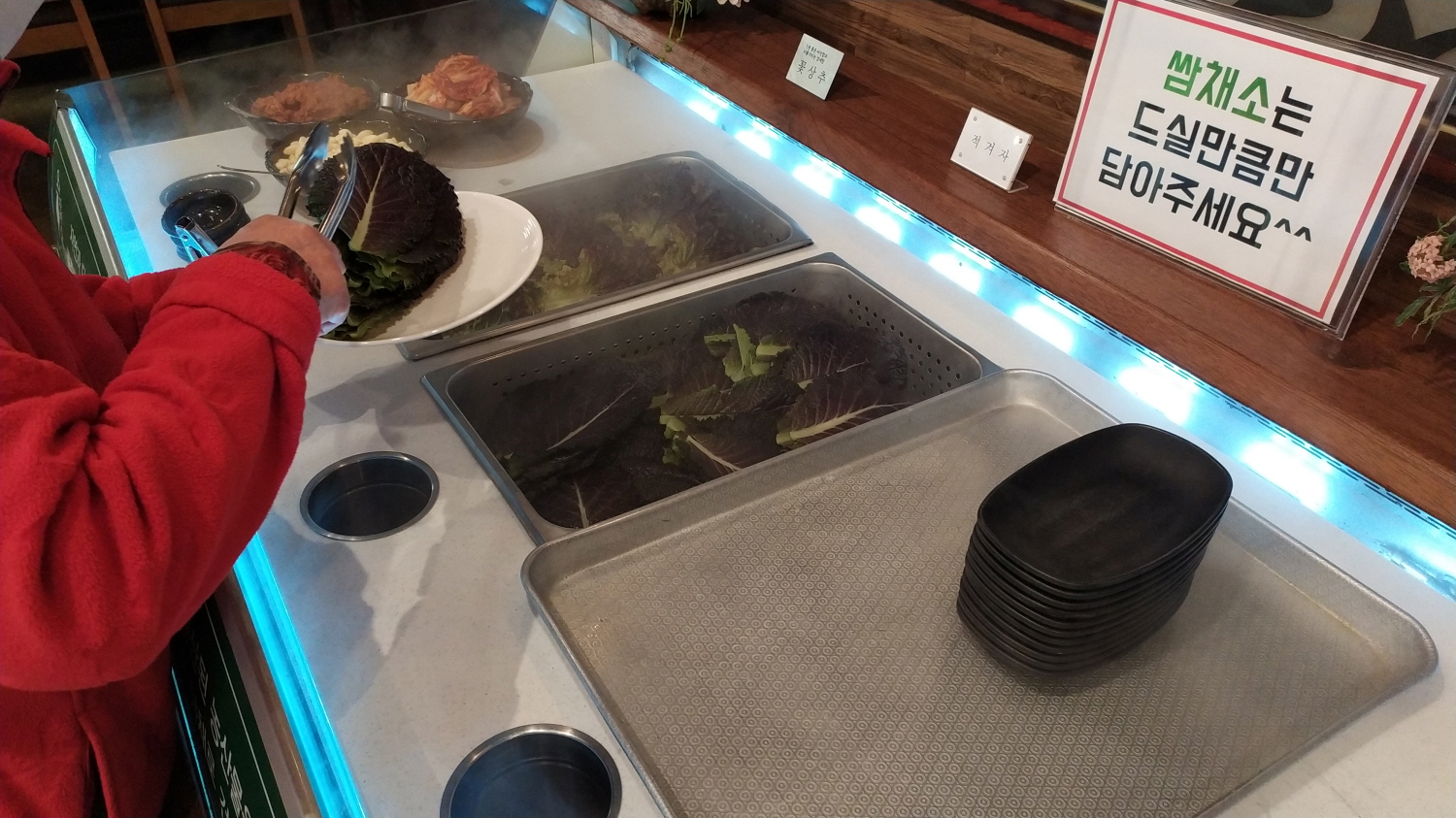 뷔페 라인 마지막에 한우불고기를 위한 쌈채소(꽃상추, 쌈배추)들이 준비되어 있습니다.