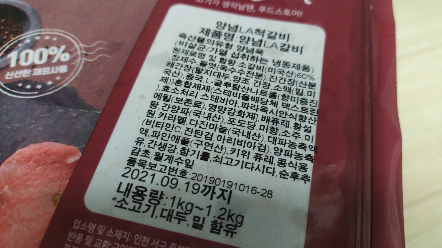 오늘 소개할 갈비는 "미국산 양념소고기, 양념 척 LA갈비 1kg 블랙 앵거스" 2팩이다. 구입가격은 팩당 21,900원~ 수입산 소고기는 아마도 처음 먹어보는 듯 하지만 기대가 된다. 목요일 주문하고 토요일 오전에 문자를 받았다.