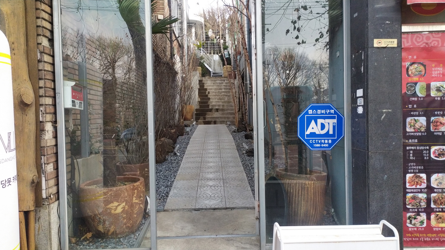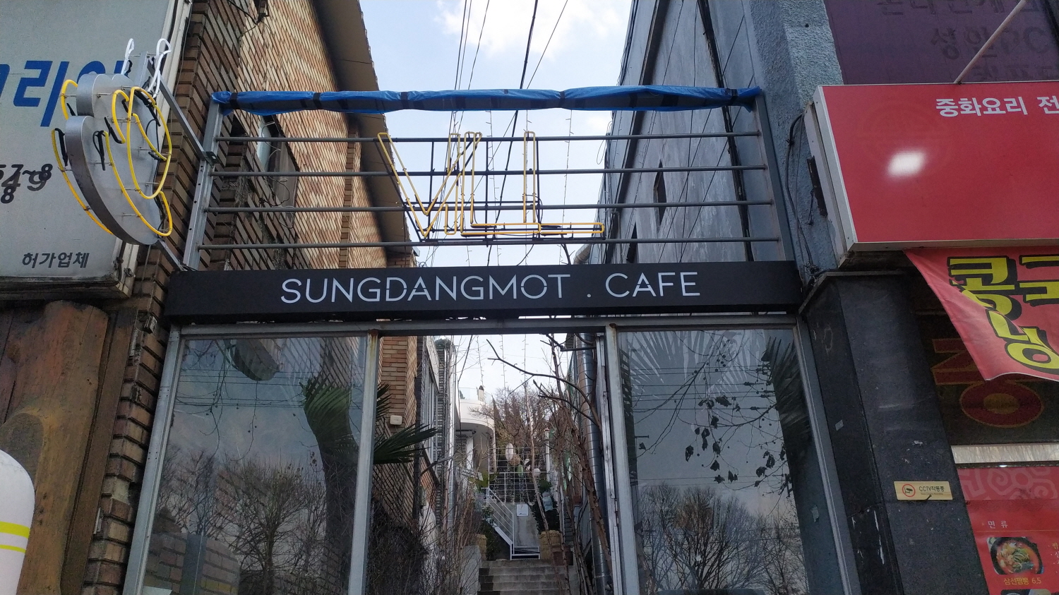 카페 빌(vill) 입구의 전경이다. 사실 들어가 보면 일반적인 골목이다. 골목에다 입구를 만들고 들어서면 양쪽에 각각의 주택들이 있다. 물론 사람들이 거주하는듯하다. 친구 왈~ 지금보다 봄이나 여름... 가을이 예쁘다고 한다. 보기에도 양쪽에 심어진 나무들이 은은한 조명을 받고 손님들을 맞아준다면 너무 예쁜 카페 입구로 보인다.